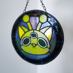 Suncatcher is roughly 8" in length. Handmade out of high quality glass and metal with a chain for hanging. (I highly advise against hanging your piece using suction cups, even for small pieces!)