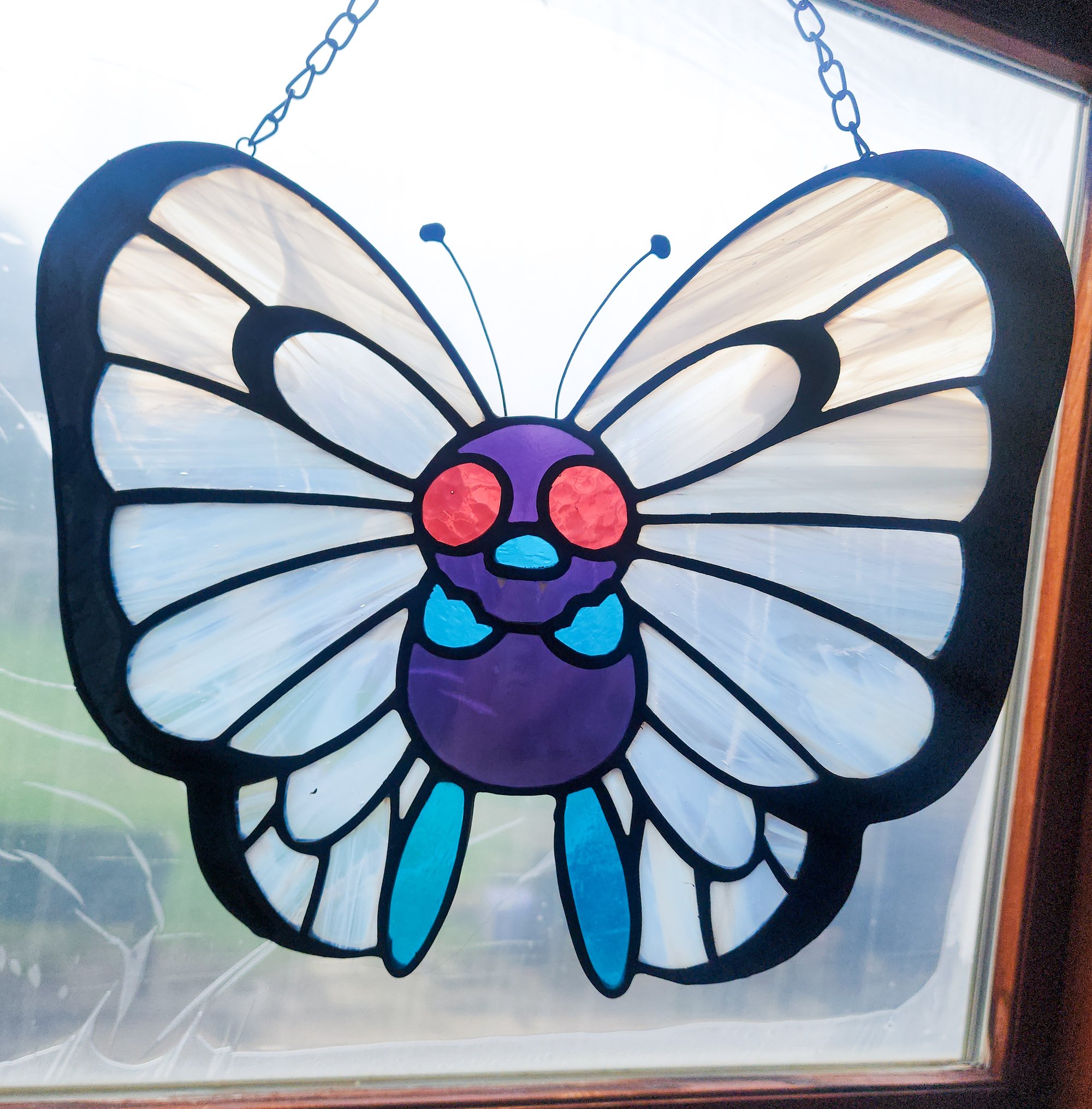 Suncatcher is roughly 11.5" in length. Handmade out of high quality glass and metal with a chain for hanging. (I highly advise against hanging your piece using suction cups, even for small pieces!)