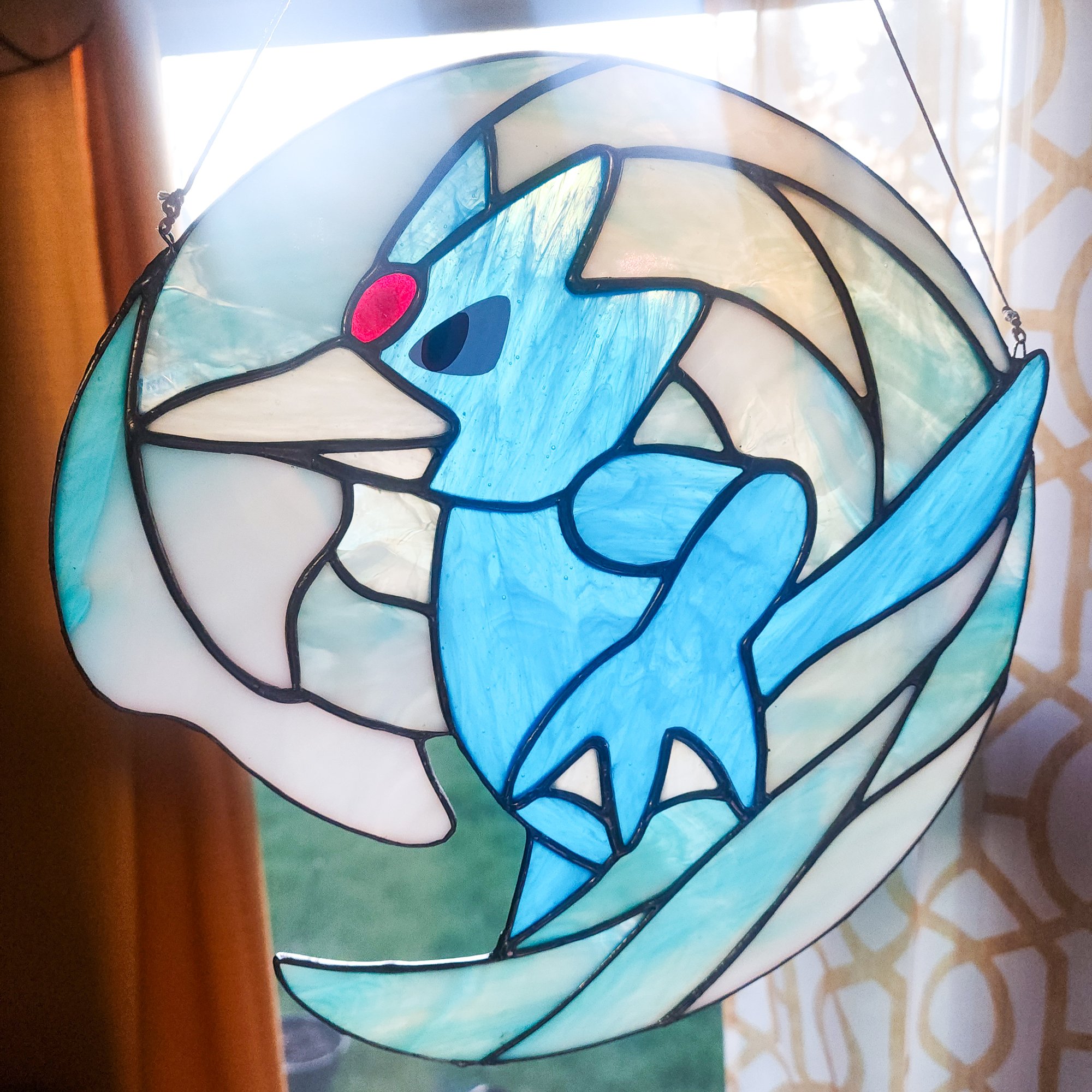 Suncatcher is roughly 11.5" in length. Handmade out of high quality glass and metal with a chain for hanging. (I highly advise against hanging your piece using suction cups, even for small pieces!)